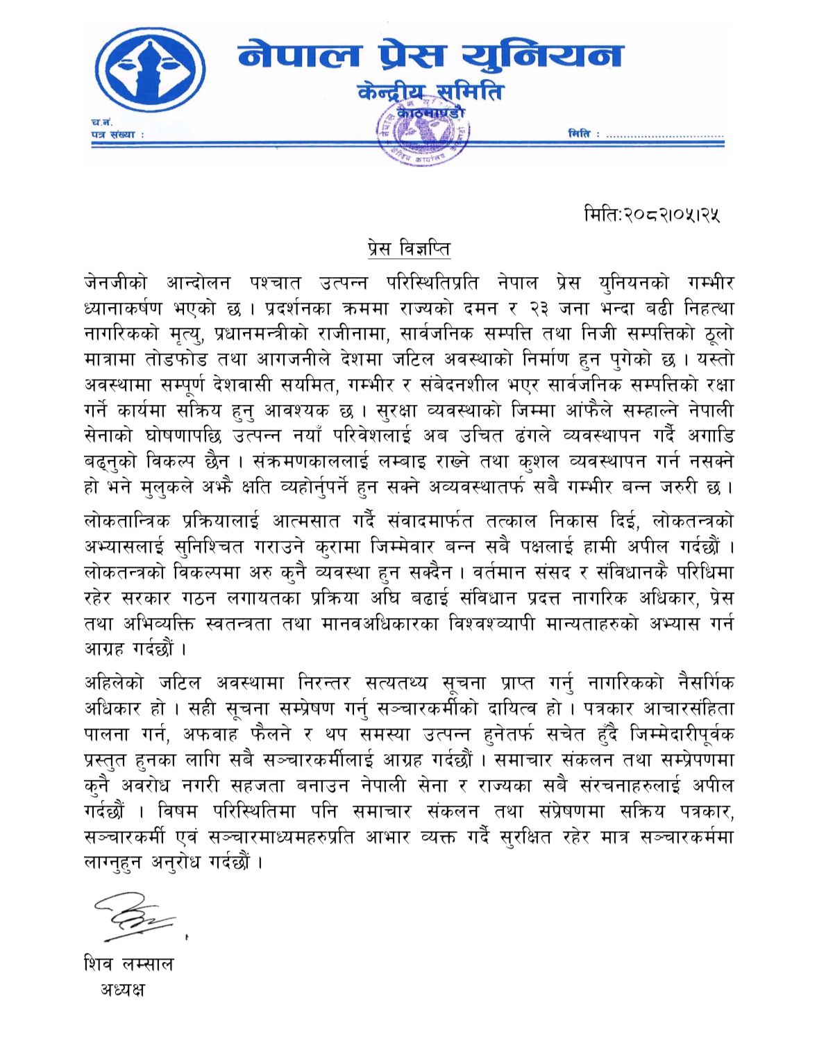 काठमाडौं – नेपाल प्रेस युनियनले वर्तमान संसद र संविधानकै परिधिमा रहेर सरकार गठन लगायतका प्रक्रिया अघि बढाई संविधान प्रदत्त नागरिक अधिकार, प्रेस तथा अभिव्यक्ति स्वतन्त्रता र मानवअधिकारका विश्वव्यापी मान्यताहरूको अभ्यास गर्न सबै पक्षलाई आग्रह गरेको छ। जेनजीको आन्दोलनपछि उत्पन्न जटिल परिस्थितिप्रति गम्भीर चिन्ता व्यक्त गर्दै नेपाल प्रेस युनियनका केन्द्रीय अध्यक्ष शिव लम्सालले जारी गरेको विज्ञप्तिमा आन्दोलनका क्रममा भएको राज्यको दमन, २३ जनाभन्दा बढी निहत्था नागरिकको मृत्यु, प्रधानमन्त्रीको राजीनामा र सार्वजनिक तथा निजी सम्पत्तिको व्यापक तोडफोडले देश संकटपूर्ण अवस्थामा पुगेको उल्लेख छ। यस्तो अवस्थामा सबै देशवासीलाई संयमित र संवेदनशील भई देशको रक्षा गर्न सक्रिय हुनुपर्नेमा जोड दिइएको छ।
