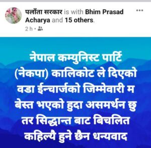 नेकपा माधव प्रचण्ड समुहको जिल्ला भेलाले आन्तरीक पाटिको जिल्ला कमिटि देखी स्थानिय तह हुँदै वडा सम्मको जिम्मेवारी वाडफाँड गरेको आनतरीक निर्णय पछी फेसबुकमा अध्यक्ष वमले, आफुलाई पाटिले दिएको जिम्मेवारी चित्र नबुझेको बताएका छन । उनल लेखेका छन ।